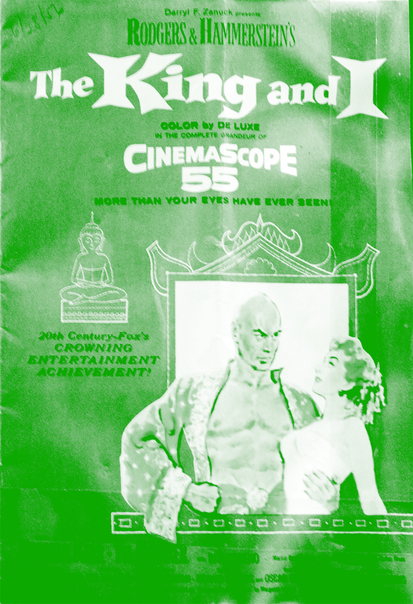 A soundtrack album for The King and I depicts a man with East Asian-features gazing at a white woman wearing a fine ballgown. The titular King in the 1956 musical film adaptation of the 1951 stage musical was played by Yul Brynner, a white actor of Russian descent, who wore dark makeup and eye tape to approximate East Asian features.