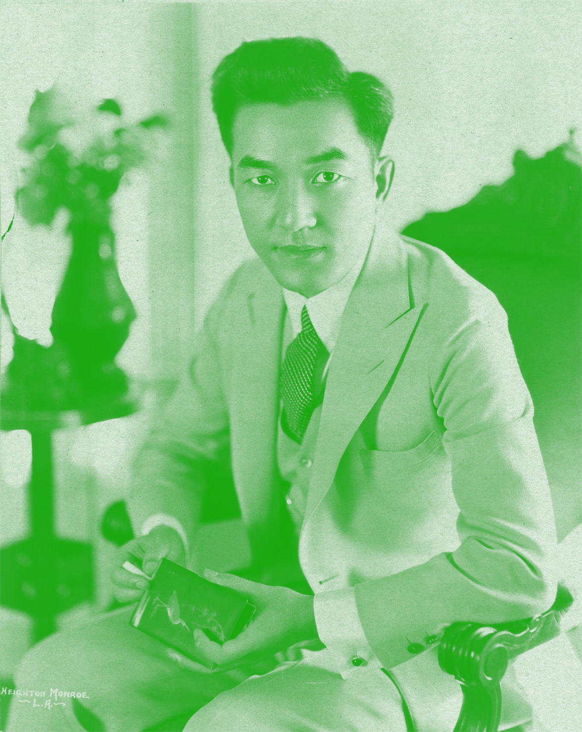 Near the Hayakawa photograh, you will see a portrait of Anna May Wong, a pioneering Chinese-American actress whose career was marked by her struggle against getting typecast in her career, orbiting between stereotypical “Dragon Lady” and demure “Butterfly” roles. Her time in Hollywood was marked by disappointment and frustration at only being able to play negatively stereotyped roles, and going so far as to be deemed "too Chinese to play a Chinese.” The opportunity for more positive and less-stereotyped roles for Asian-Americans came in the 1930s following a growing American sympathy for China in its struggles with Japanese imperialism.