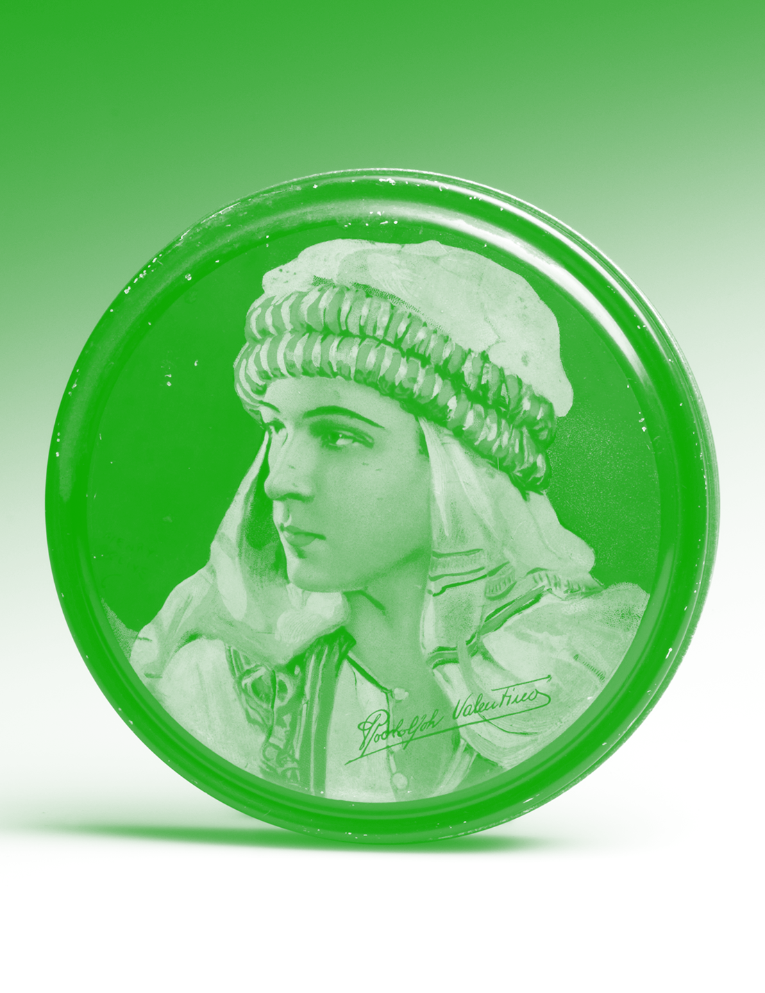 This beautebox depicts Rudolph Valentino in his role in the 1921 silent film The Sheik. Rudolph’s dark eyes and hair and “exotic” foreign heritage first typecast Valentino into villain roles. Later, after finding widespread success with his roles in The Four Horsemen of the Apocalypse and The Sheik, he became known as the “Latin Lover,” a persona constructed in part by the Hollywood studio system.